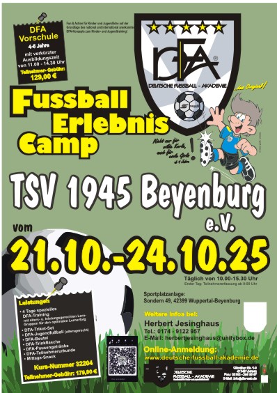 Wie im April 2025 richtet TSV 1945 Beyenburg e.V. im Zeitraum vom 21. - 24. Oktober 2025 in Kooperation mit der Deutschen Fußball-Akademie GmbH (DFA) ein Fußball-Erlebnis-Camp für fußballbegeisterte Kids im Alter von 4 - 13 Jahren aus.